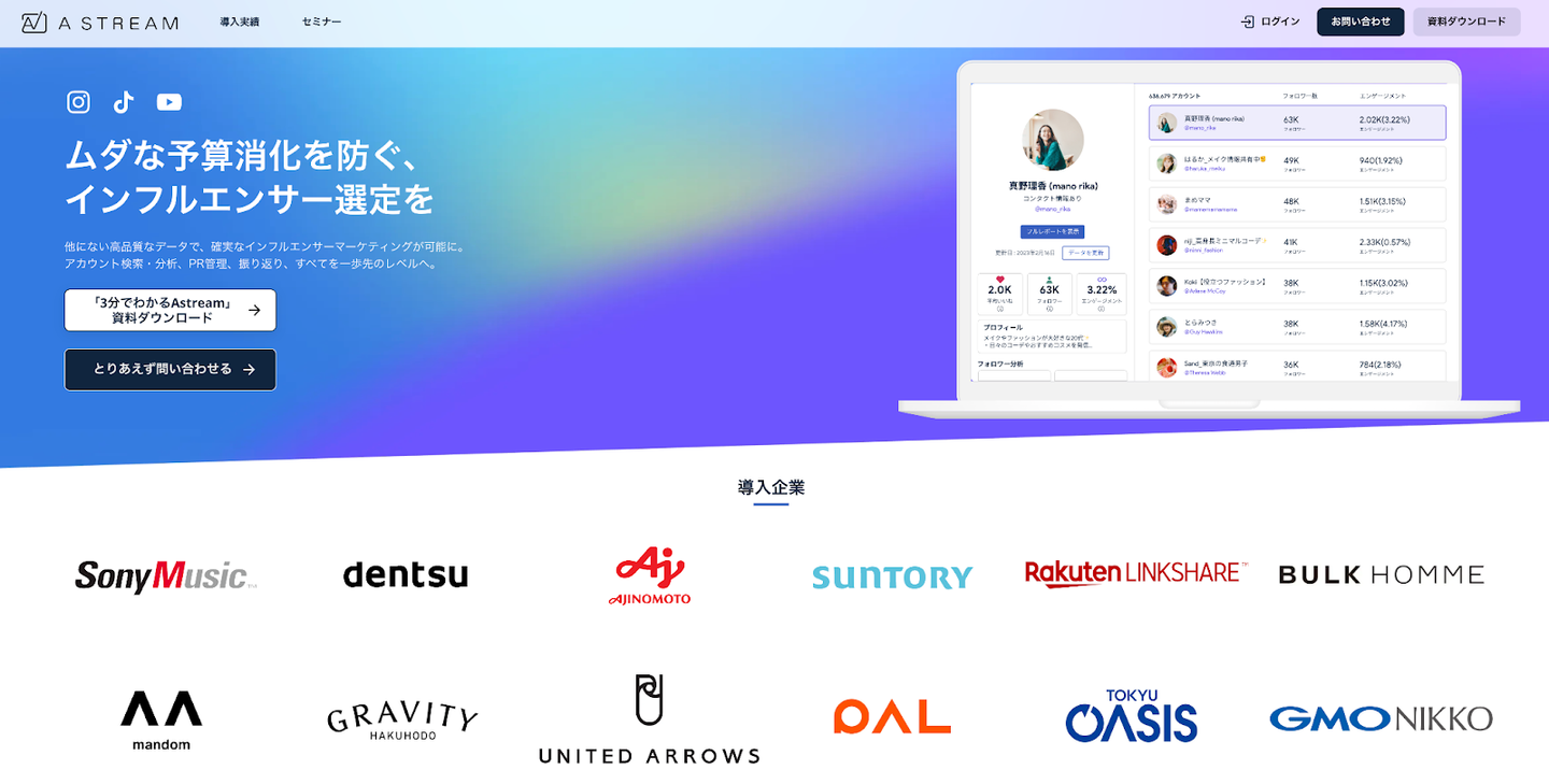 (インフルエンサーマーケティングツール『Astream』のサービスページ)
