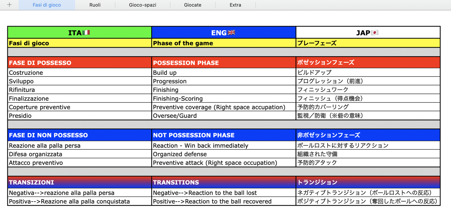 例えばこちら。日本人コーチたちに共有しているサッカーの専門用語リスト。イタリア語・英語・日本語でまとめたファイルの一部です。