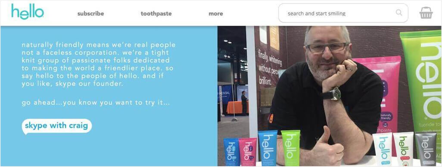 アメリカのオーラルケアメーカー 《Hello》のCEOであるクレイグ・ドゥビツキーは、既存のやり方に満足していませんでした。そこで彼は、サイトを訪れたすべてのユーザーが彼自身のSkypeにワンクリックでコールできるボタンを用意したのです。