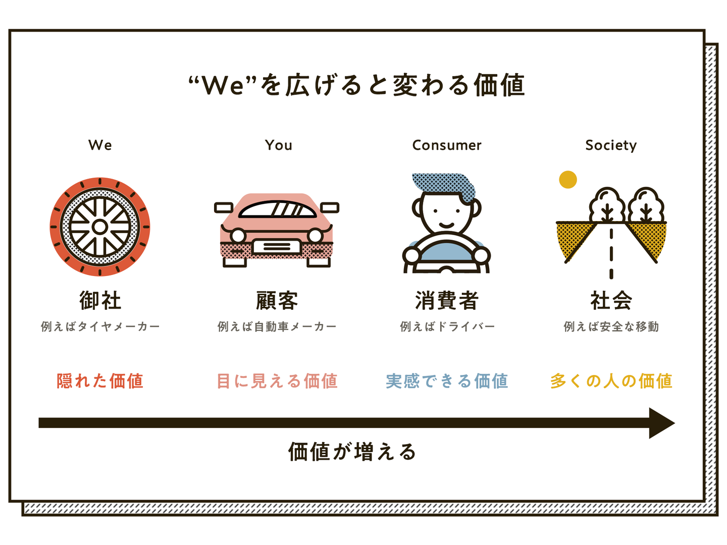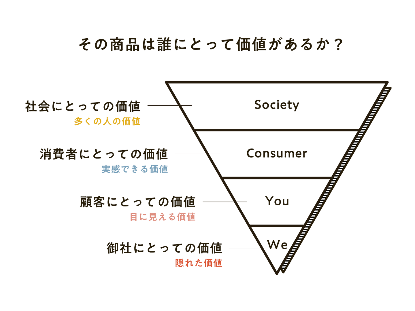 ここまでの話で、「私たち」「あなた(顧客)」「消費者」、そして「社会」へと話の視点を変えることによって、その価値が高まっていくことを分かっていただけたと思います。