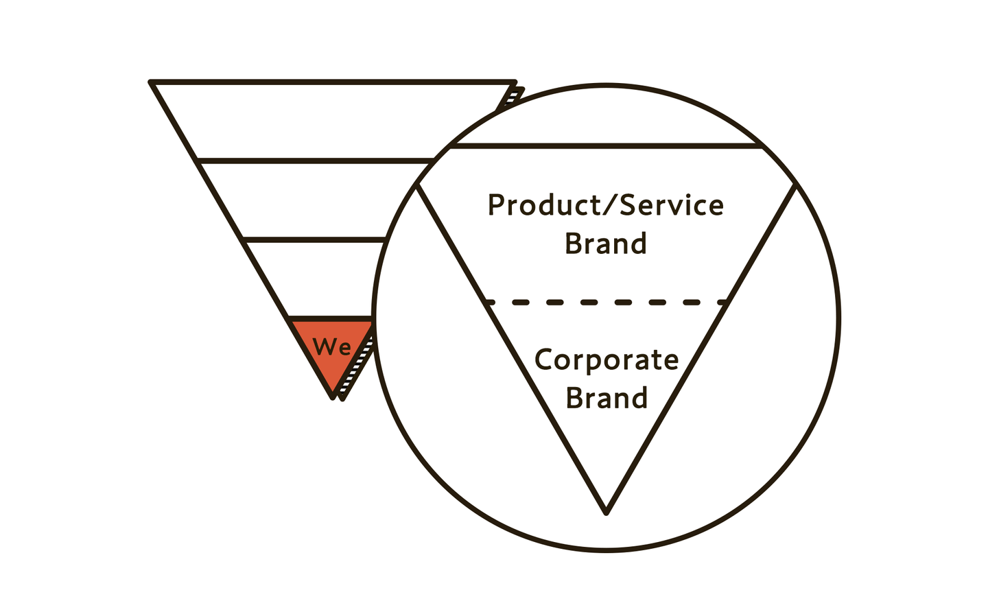 とはいえ、すべてのブランドはまだまだ最下層部の「We」セクションを使用してコミュニケーションをする必要があります。しかも、この「We」セクションは、ほとんどの企業で「コーポレートブランド」と「サービス・製品」の2つの層に分けることができます。