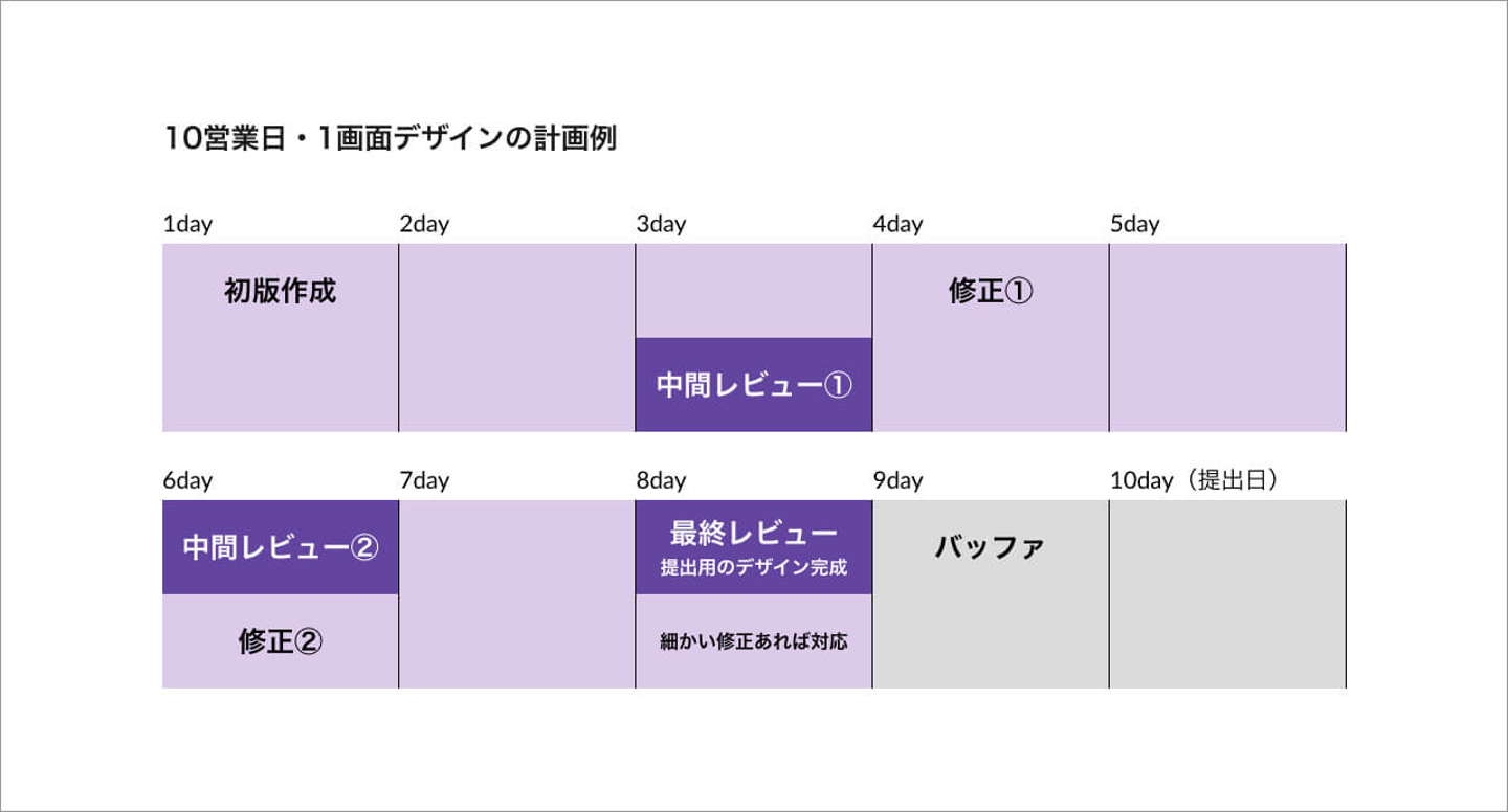 計画を立てる際には、レビューと修正を何度か繰り返す想定をしましょう。しっかり作り込む前にデザインを見せて、徐々に調整していくようなスケジュールの組み方をすると、大きな手戻りなしに進めることができます。一発でOKはもらえないつもりで計画を立てることがポイントです。