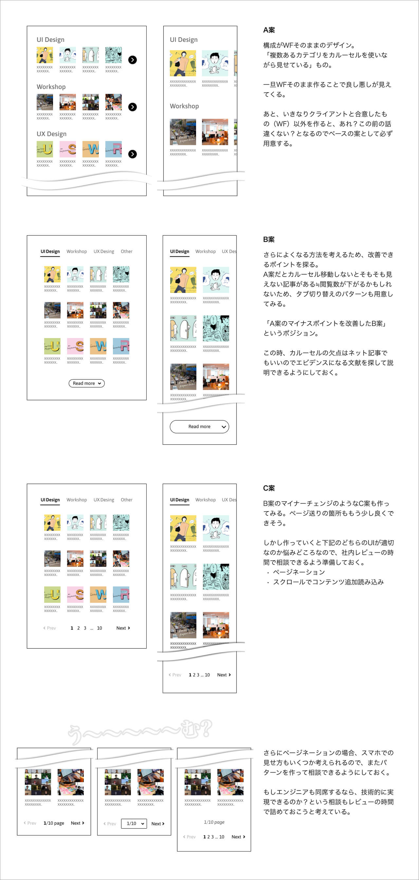 自分で手を動かす際は、さまざまな工夫をするのが効果的です。たとえば、文字にすることで、今のデザインのどこが気に食わないのか? どこが懸念点なのか? ユーザーにとってどんなものなのか?といった疑問を言語化することができます。