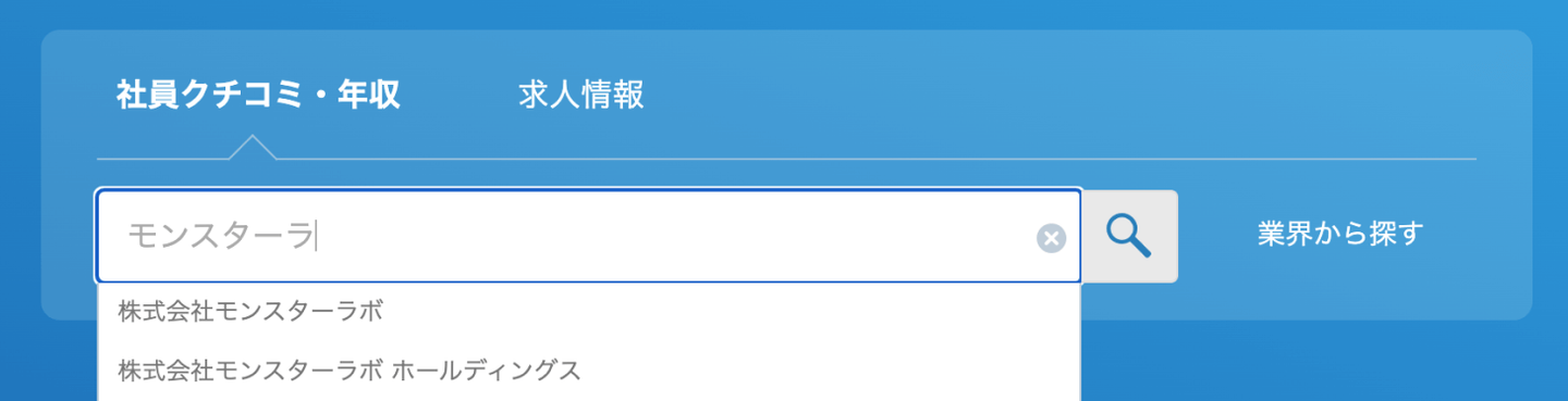Openworkの企業検索フォームは、入力途中でも候補が出現する。