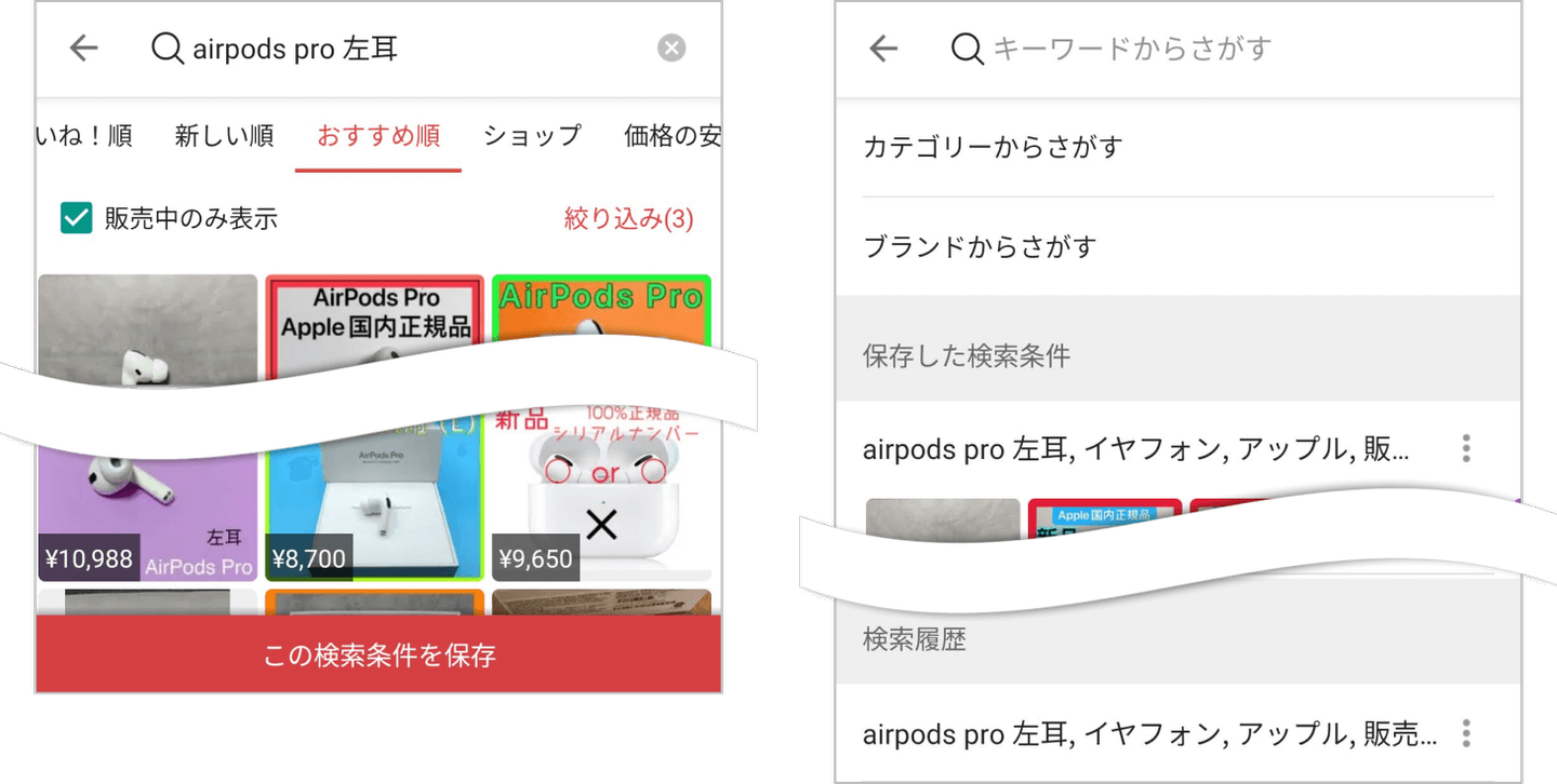 このニーズを満たすため、検索機能を持つサービスの多くは「過去に検索した条件の履歴」をしばらく残したり、指定の検索条件を保存できたりする機能を持っています。たとえば、フリマアプリメルカリでは、かんたんに検索条件を保存し、再検索できるように設計されています。