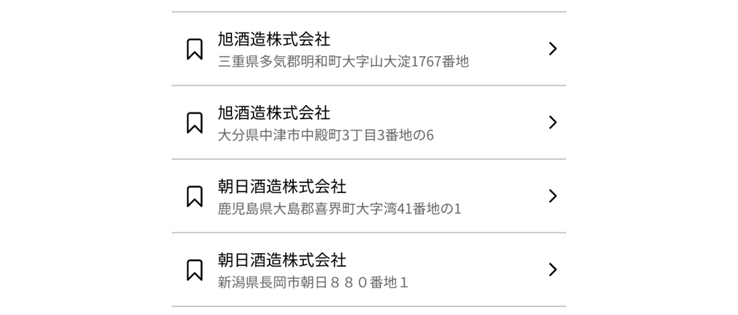 記事の冒頭で触れた、私が先日担当したアプリは「企業の情報を検索するアプリ」でした。このアプリでは同名の企業を識別しやすいように、検索結果のページで、企業の名前に加えてその所在地を併記するように設計しました。