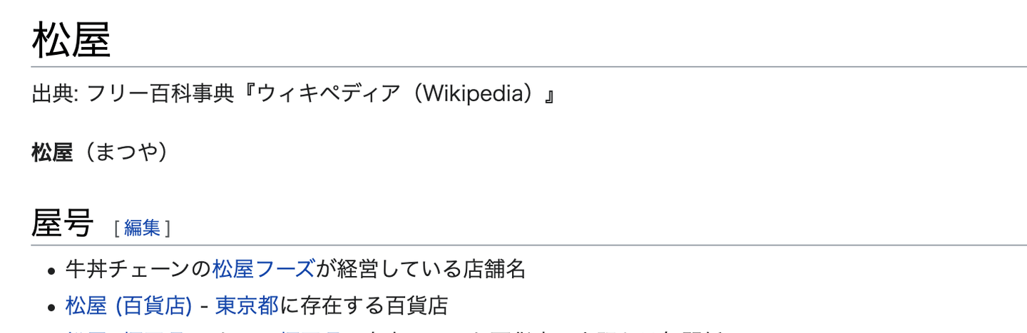 Wikipediaで「松屋」と検索すると、牛丼チェーンか百貨店かを選ぶためのページが表示される