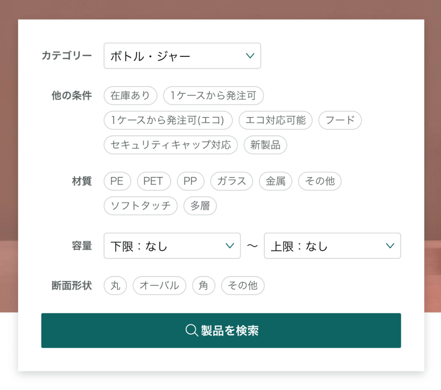 容器メーカー竹本容器のWebサイトの製品検索フォームは、フリーワードによる検索ができません。容器名が「A-10U」など型番なので、フリーワードによる検索にあまり意味がないためです。かわりに、検索条件を細かく設定できるように設計されています。