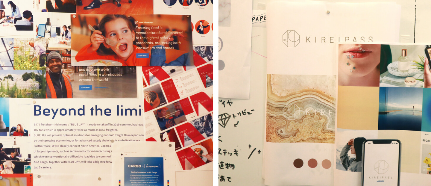 オフィスの壁をつかったイメージボード。別の案件へのヒントになったり、通りすがりの人からの意見なども参考に。
