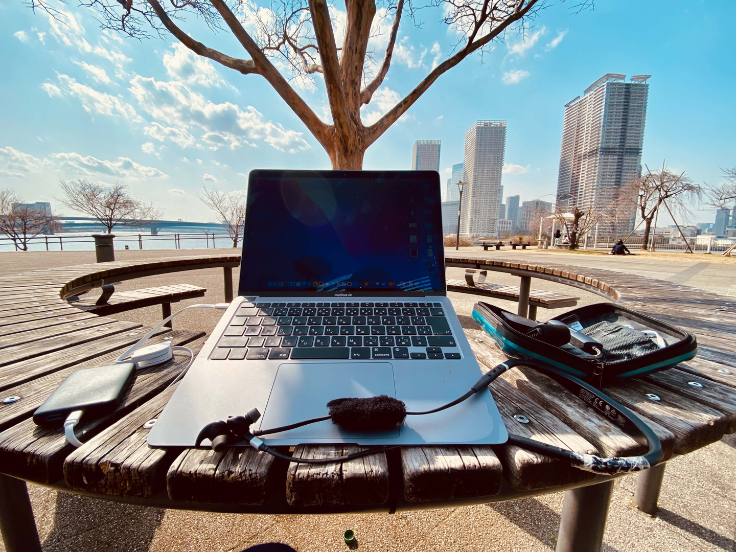 多くの時間は家ではなく、外や車中をデスク化。外ではマイクの風防強化、車中では南向き駐車が最重要。さすがに書斎ほしい。