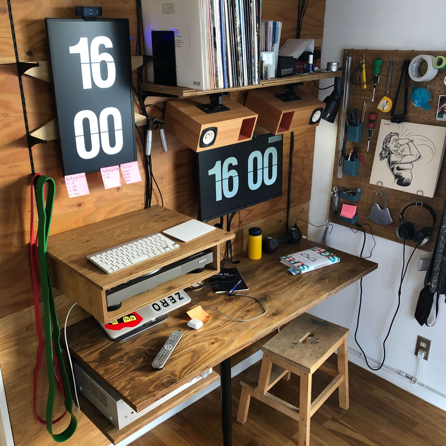 体が凝らないため、自分の195cmの身長に合わせたDIYスタンディングとシッティングデスクです。リモート会議は左で立ちながらやって、作業は右で座ってやることが多いです。