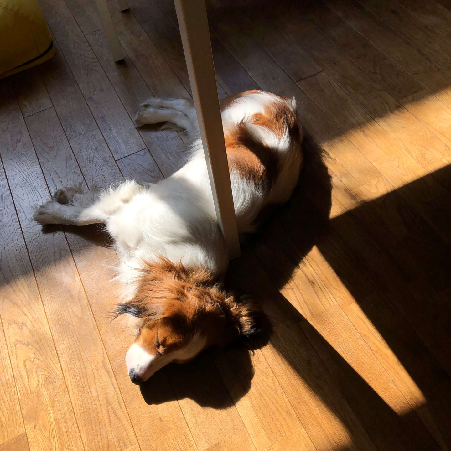 犬は一日ほぼ寝ています。会議が終わると、最後の「おつかれさまでした」に反応して、挨拶しにきます。