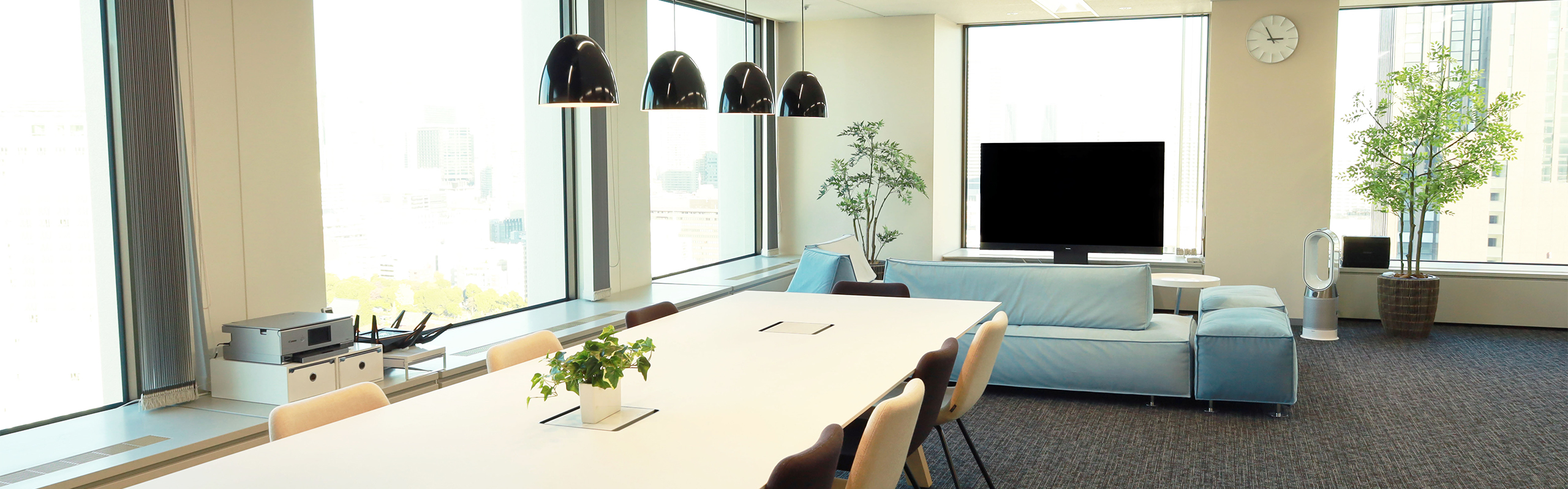 『Home』をテーマとし、「現場にいる社員が戻って来たくなる寛ぎの空間」をコンセプトに作りました。大きな窓によって日中は明るく、