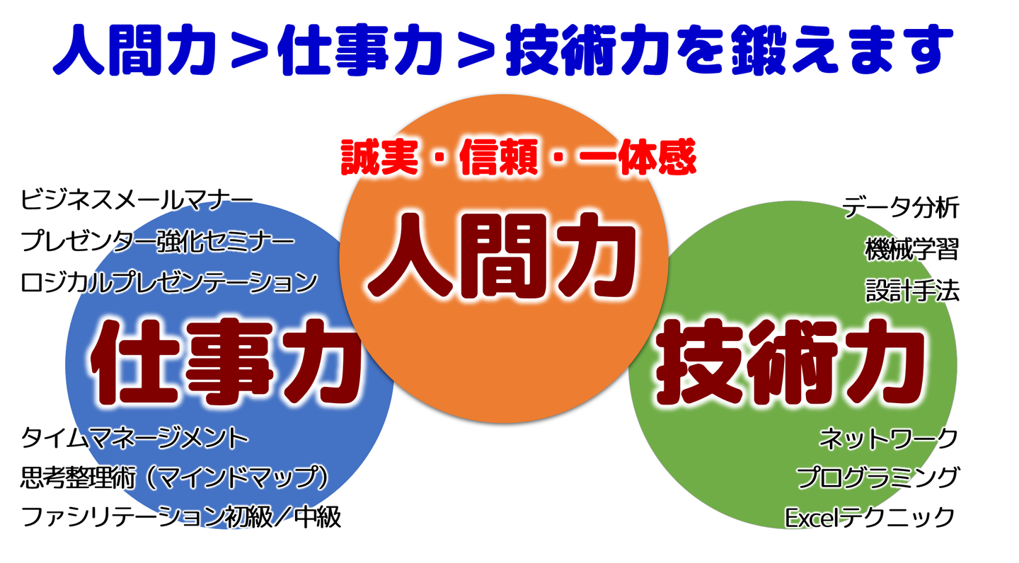 当社では、育てる能力を下図のように大きく人間力・仕事力・技術力の3つにわけており、