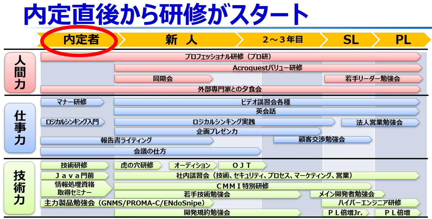 入社するころには、プロの社会人として活躍できるスタートレベルに並べるのがアクロのスピードです。
