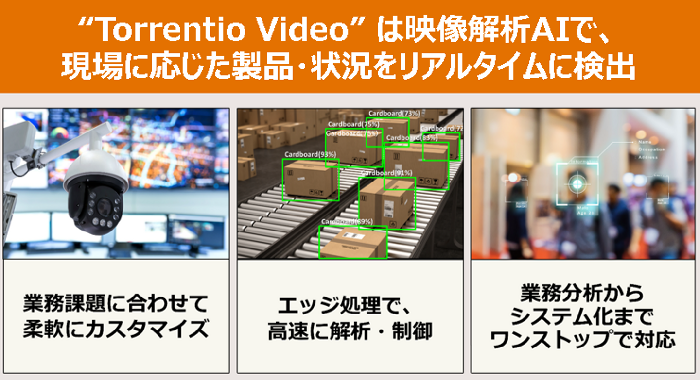 『Torrentio Video』は、画像・映像解析による産業向け物体検出AIソリューションで、特定の物体検出や異常検知により、人の“目”の代わりを実現し、業務の自動化・効率化を実現します。