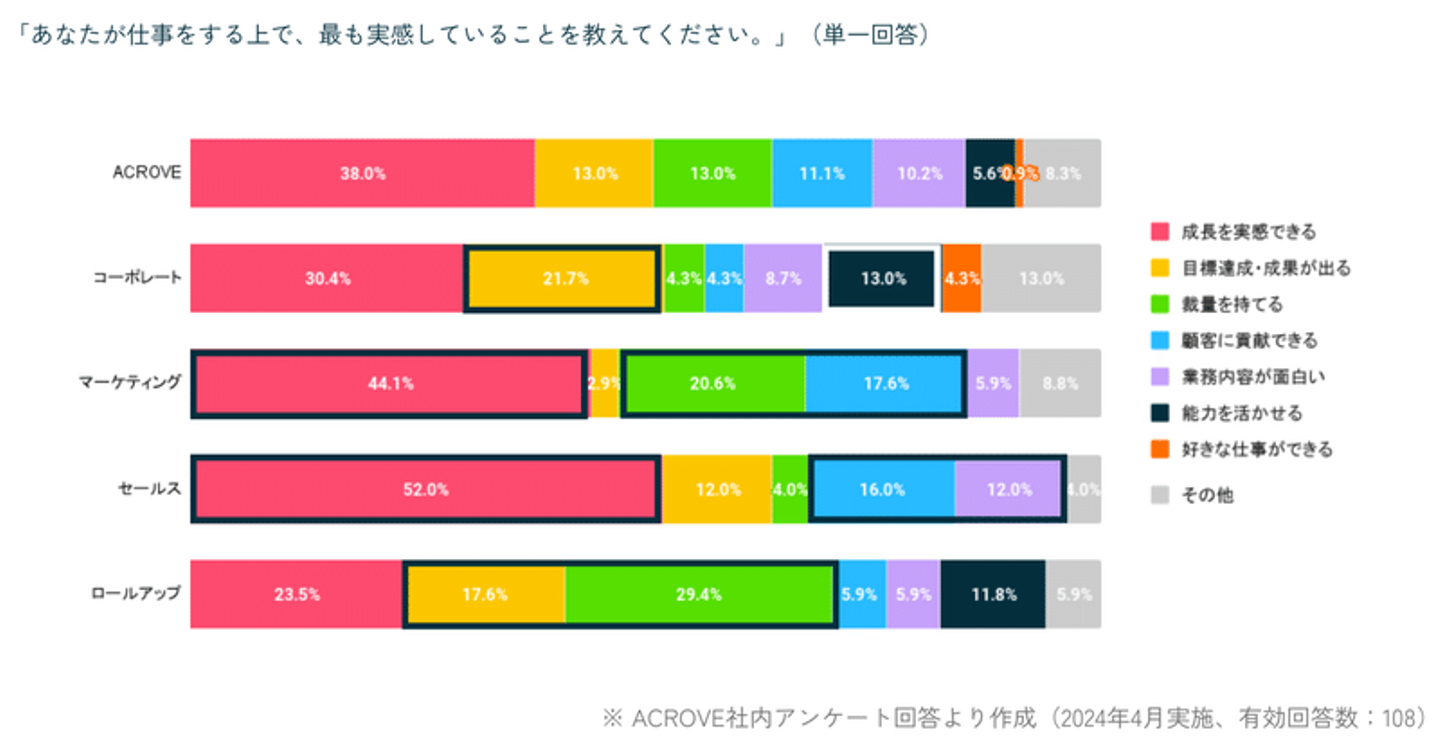 ロールアップ部門では、「目標達成・成果が出る」「裁量を持てる」がACROVE全体傾向と比べてポイントが高い傾向でした。