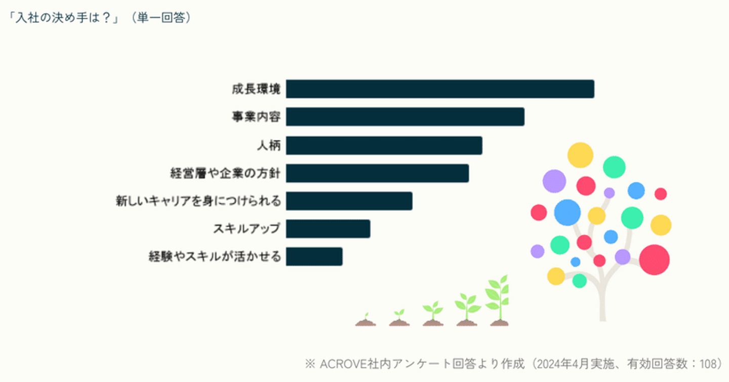 最も決め手となったのは、「成長環境」、次に「事業内容」「人柄」との結果になりました。