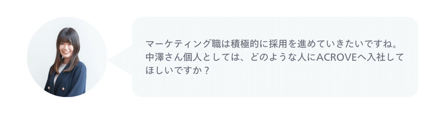 今の時点で知識や経験がある必要はないので、お客様のビジネスでも自社のビジネスでも、拡大させるために何をすればよいかを考えて行動できる人にはぜひACROVEへ来てほしいです。