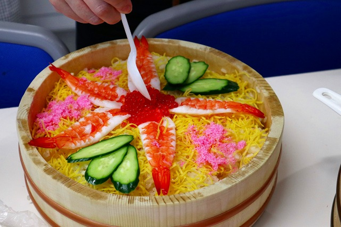 寿司桶からいただくも良し、自分で酢飯をよそって具材を盛りつけるも良し!