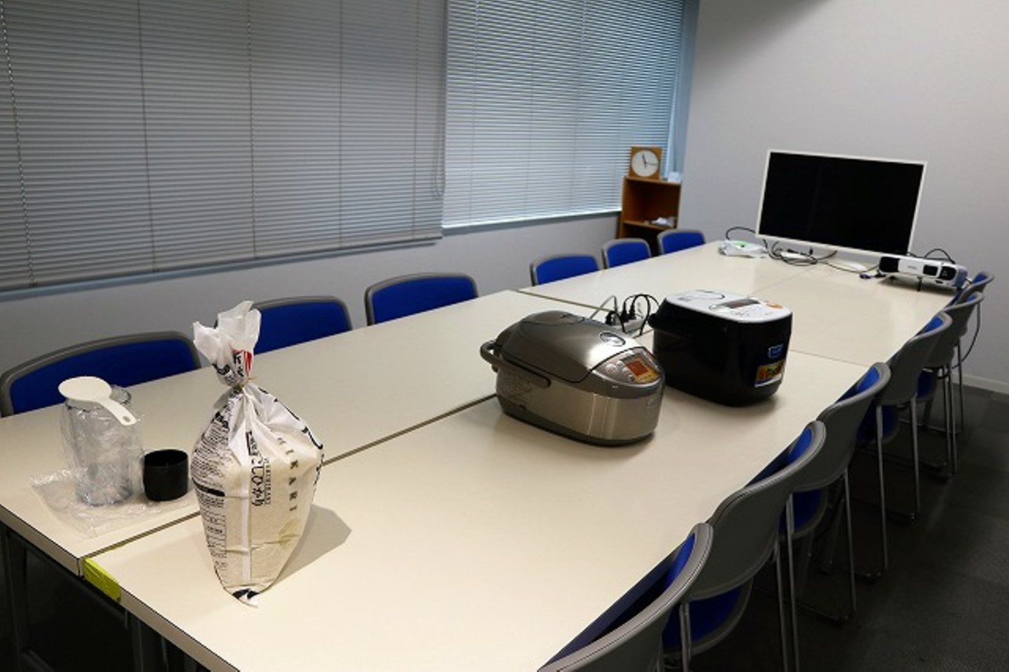 会議室には2台の炊飯器が。近くに住むスタッフが雨の中自宅から炊飯器をもってきてくれました!感謝です!!