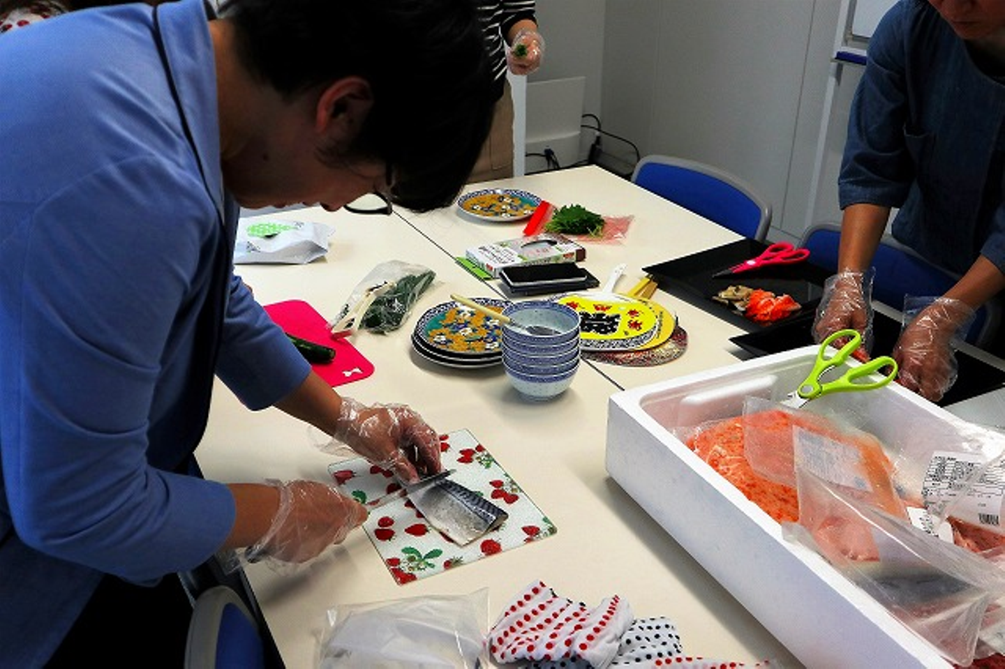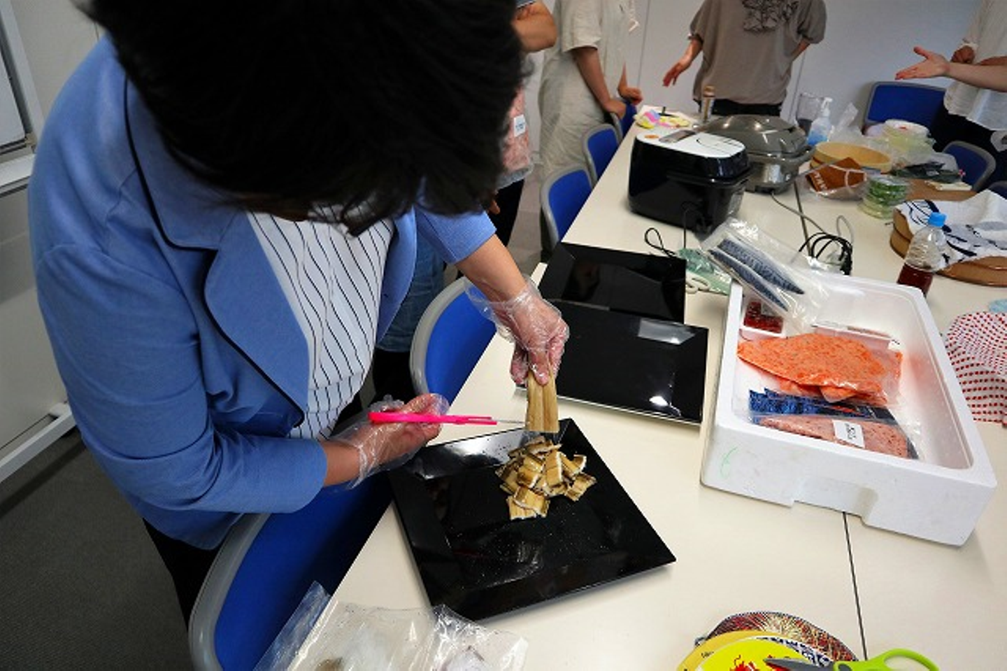 さあ、盛り付けです。スタッフ持ち込の寿司桶で、より本格的!