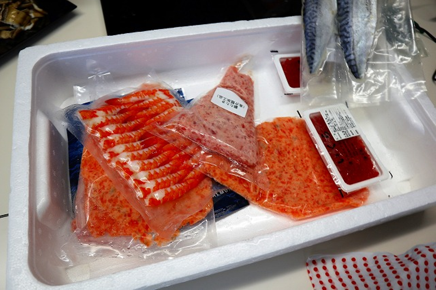 程よく解凍された食材たち。シメサバ、いくら、鮪たたき、サーモンたたき、エビ、そしてズワイガニほぐし。