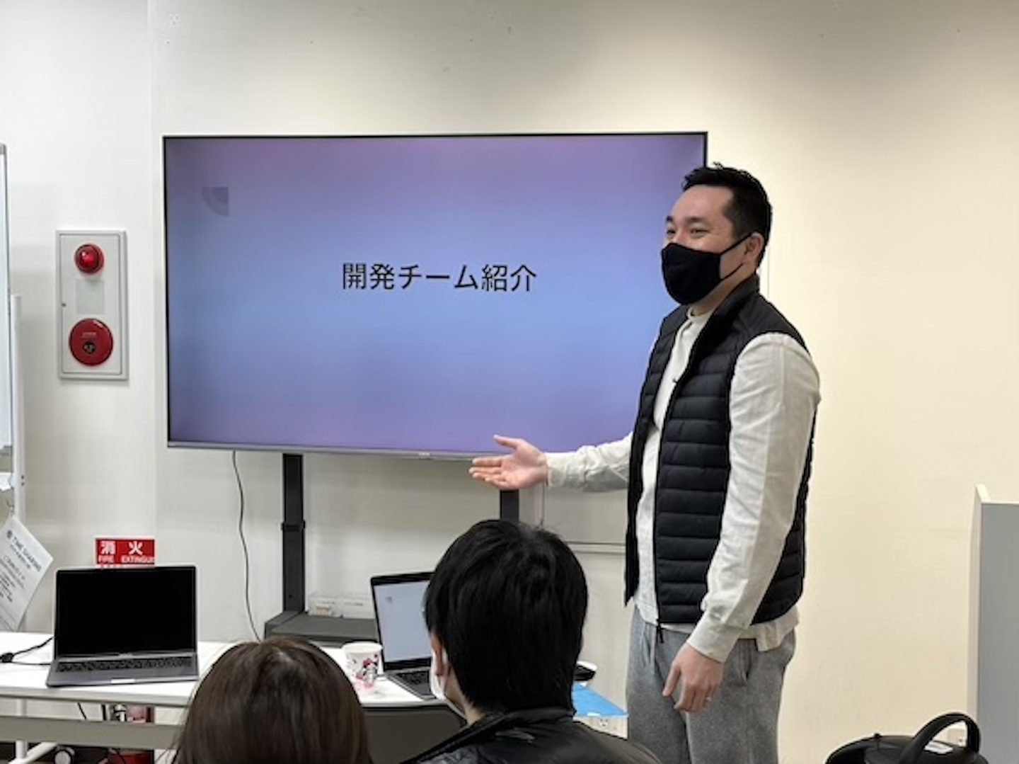 新入社員の自己紹介・質疑応答の後は、迎え入れる側である当社の部署ごとの紹介になります。新しくご入社いただく側、受け入れる側、双方の理解を深めることができたのではないかと思います。写真は日・中・米出身のメンバーが揃った開発チームのグローバルな部署紹介です。