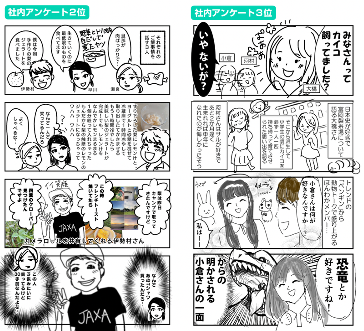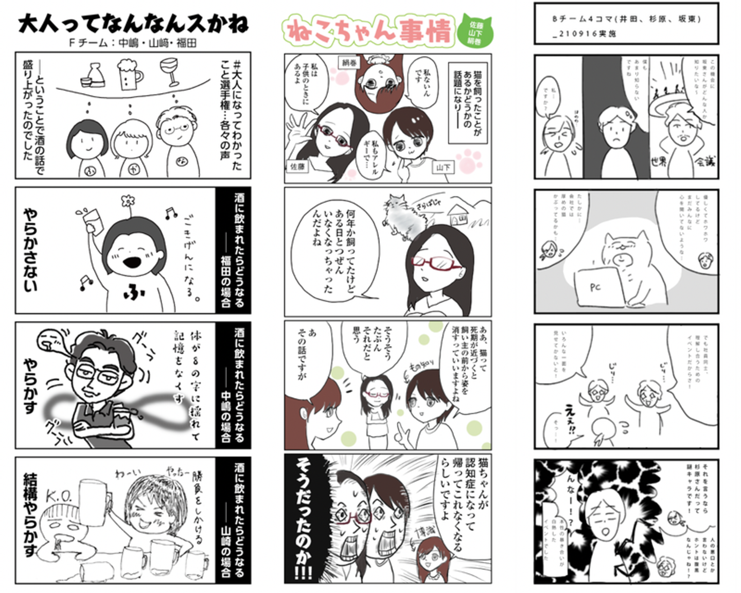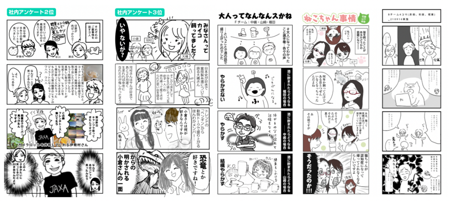 休憩時間にならないように、と導入した4コママンガ制作でしたが、共通の目的のもと雑談するのがとてもやりやすかった、というコメントの通り、普段コミュニケーションをあまり取らない人同士の雑談会には、潤滑油の役割を果たしたようです。