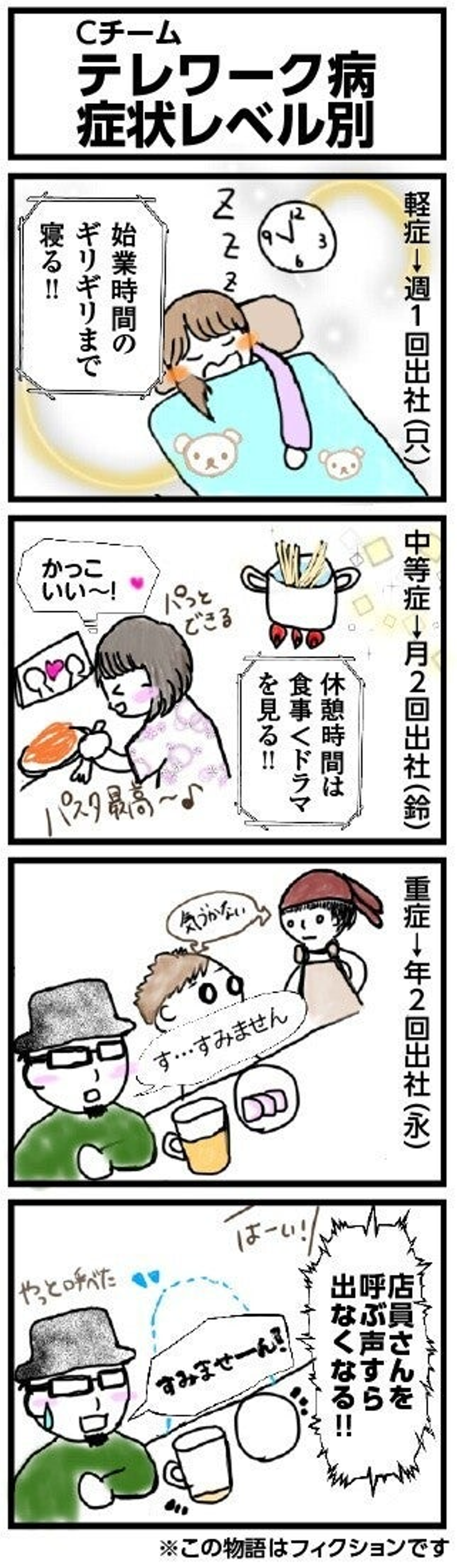 社歴20年のベテランデザイナー(永)と、社歴3年営業担当の(只)、20年に新卒で入社した(鈴)と、バラバラの属性のメンバーが集まったこのチーム。「テレワーク病」をテーマにマンガを制作しました。同じテレワークという環境でも、人によって過ごし方が全く違いますよね。3名の社員それぞれの個性を垣間見れる、すてきなマンガで、堂々の1位となりました!