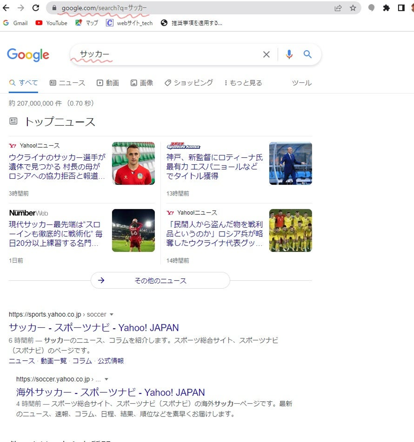 検索した「サッカー」というテキストが、URLのパラメータとなってアドレスバーのURLとして表示されています。