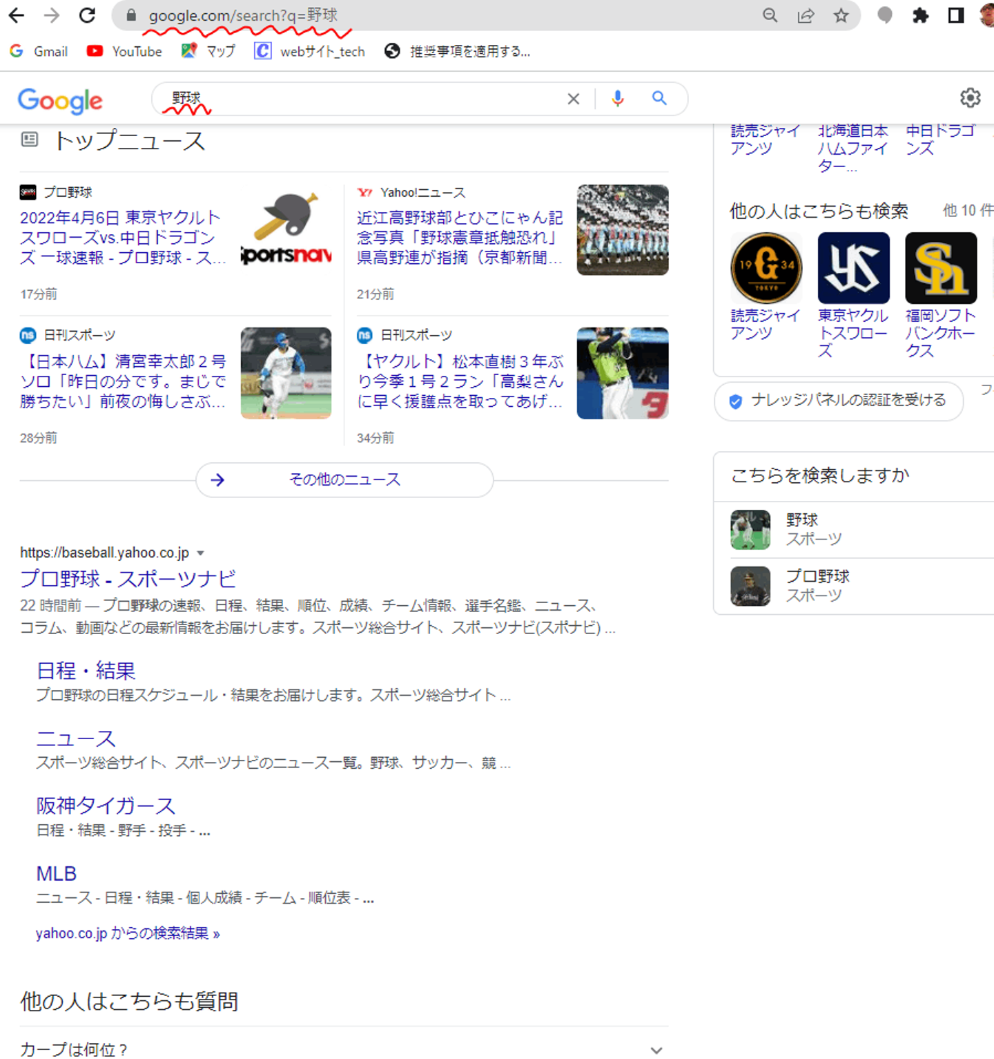 アドレスバーのパラメータを変更してもちゃんと野球の検索結果が表示されました。