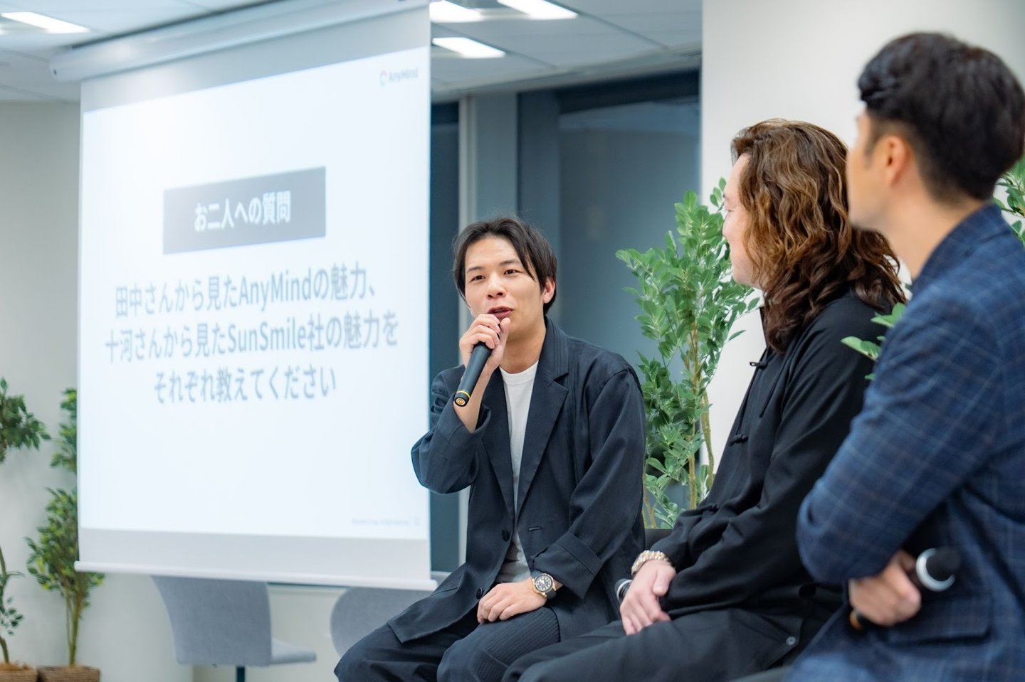 当日は、AnyMind Groupおよびサン・スマイルそれぞれの事業紹介に加え、両社トップによるクロストークや懇親会を実施し、今後の連携や協業を見据えた相互理解を深める機会となりました。本記事では、その当日の様子をご紹介します。