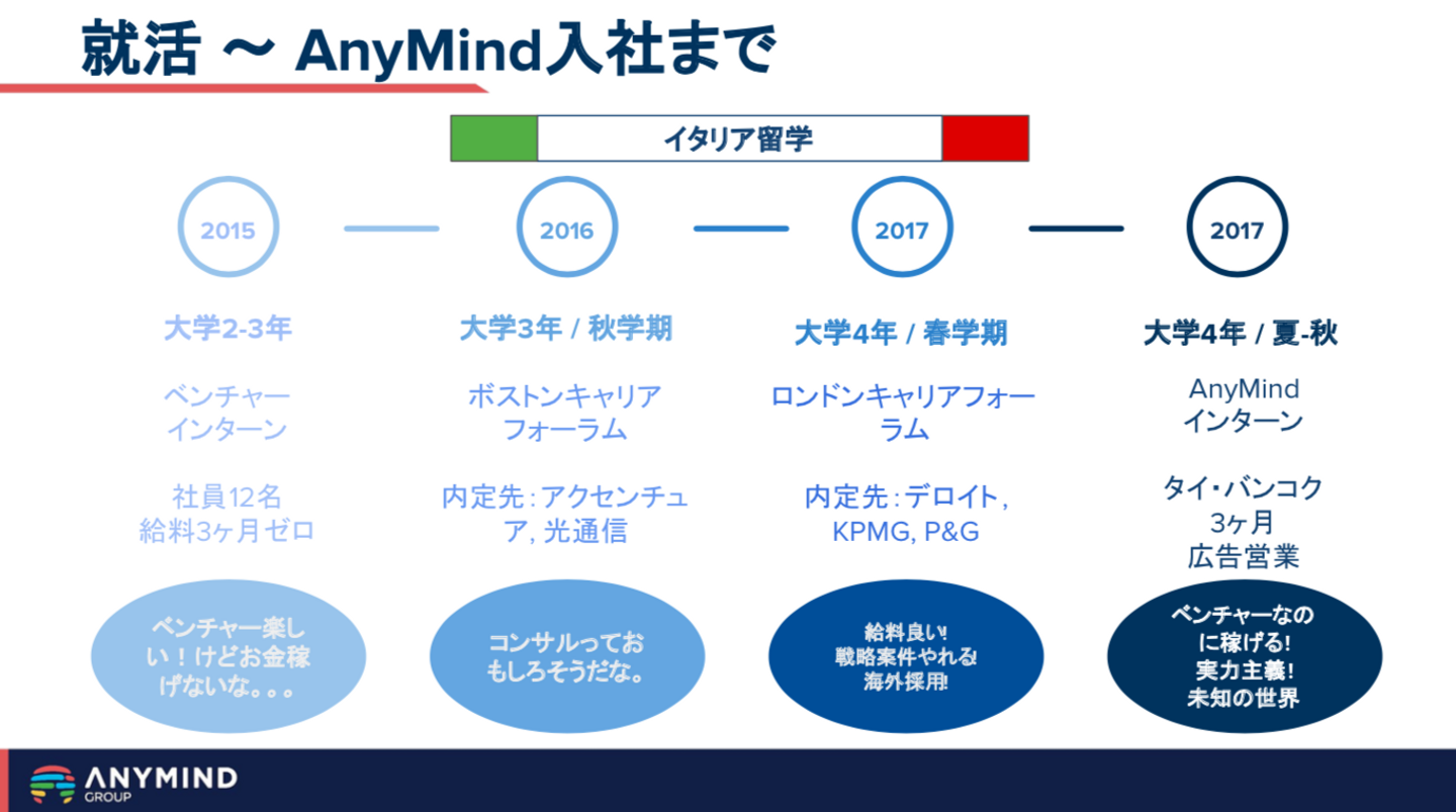 イタリア人のように、仕事が全てじゃないという考え方もある。けど僕は、この人たちみたいに、仕事を誰よりも楽しんで、何か大きなことを成し遂げたい。チャレンジするなら今しかない。こうして僕は、AnyMind Groupへの入社を決断しました。