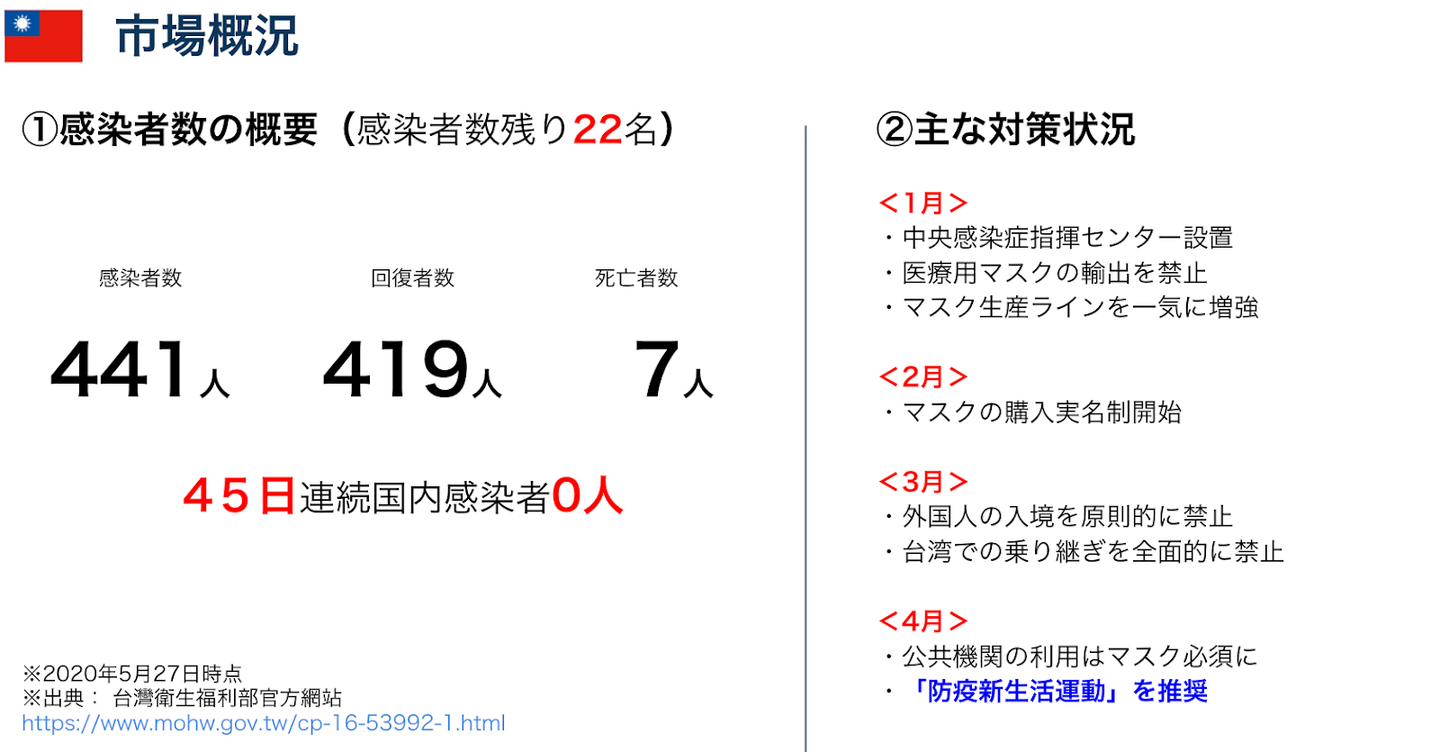 台湾については対応が早かったこともあり、45日間の感染者数0に伴い、徐々に従前通りの生活が戻ってきたことに触れ、下半期からは経済も回っていく。旅行などは難しいものの、消費活動・投資も改善していく見通しだという見解を述べました。