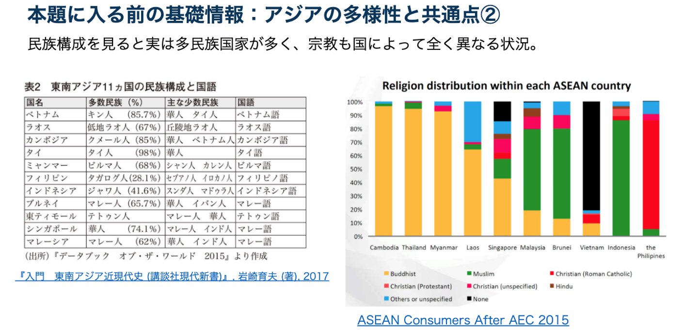 本パートでは、アジア各国の人口推移やネット普及率・SNS利用率、宗教や民族構成など基本的な各国の総括を語りました。