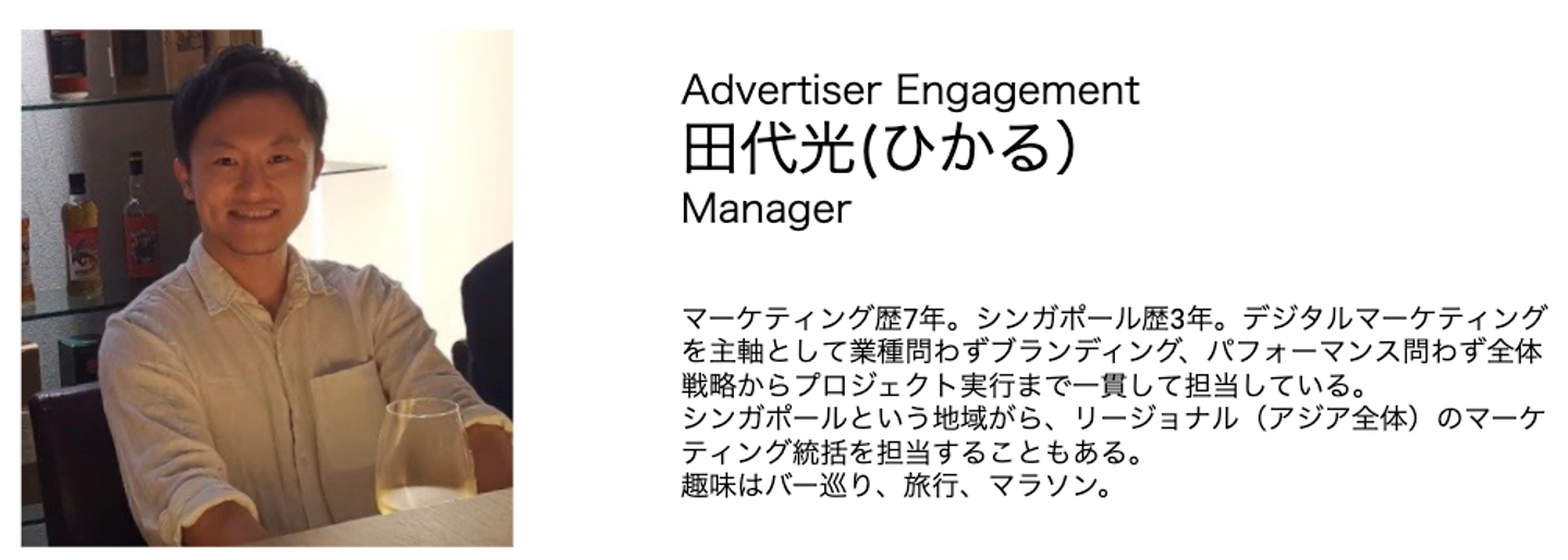 シンガポール:田代 光(Manager, Advertiser Engagement)