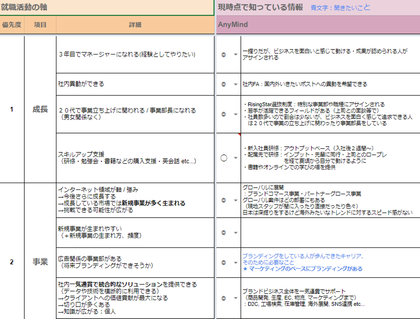 縦軸と横軸に、自分が就職先を決める上で大事にしたい要素と自分が興味を持っている会社を並べることで、会社ごとに自分が知っている情報とこれから情報収集をしていくべき情報を綺麗に棲み分けできるようになったんです。