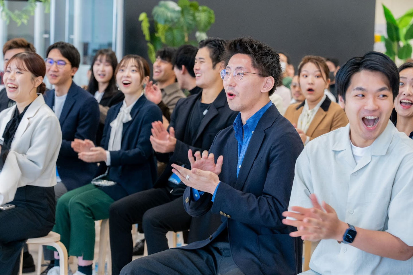 開会して早速、30名の配属先が発表されました!一人ひとり名前が呼ばれ、配属先が発表されると新入社員だけでなく、既存社員からも拍手や歓声が上がりました。