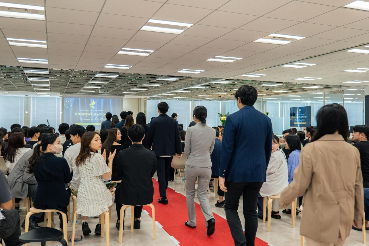 社員の皆さんの期待の眼差しの中、内定者がレッドカーペットを歩き入場しました。 新たな仲間を迎えてフレッシュな雰囲気と共に内定式スタートです!