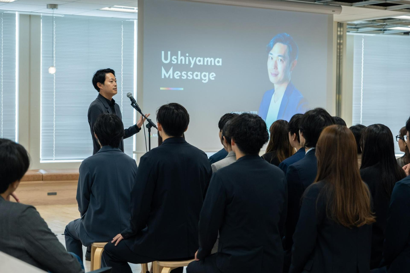 まず初めに今年の内定式の司会を務める新卒採用担当の河村さんの開会の挨拶ののち、AnyMind Japan取締役の牛山さんから内定者に向けたメッセージがありました。