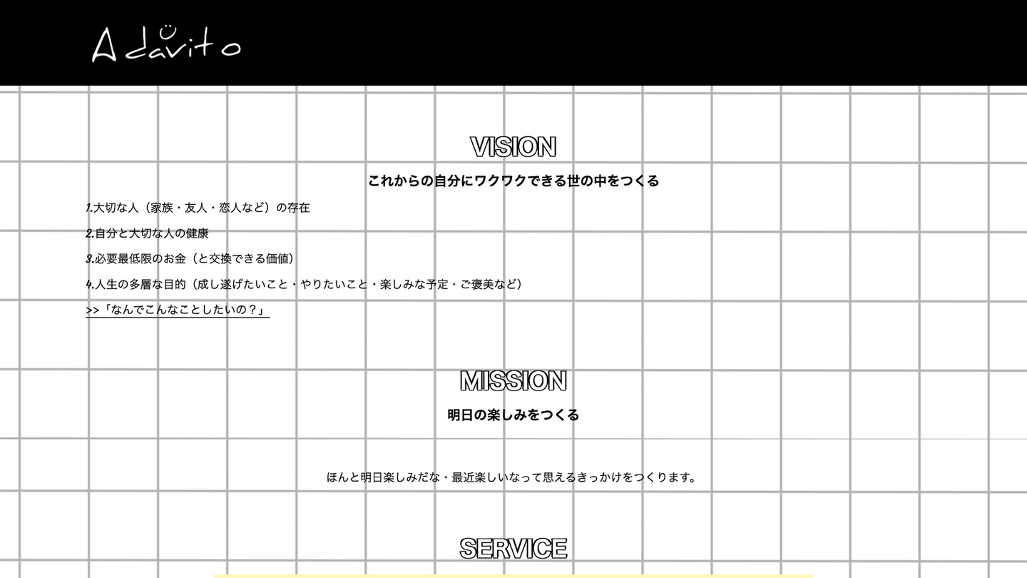 アダビトのビジョン・ミッション・バリュー(行動規範)、サービス紹介、メンバー(代表+役員)、会社概要を掲載しているため、「そもそもどんな考えを持った会社なの?」がわかります。