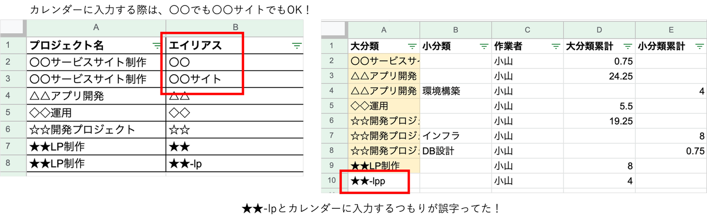 Googleカレンダーで左の表のように記載したものが、右の表のように集計されるイメージです。
