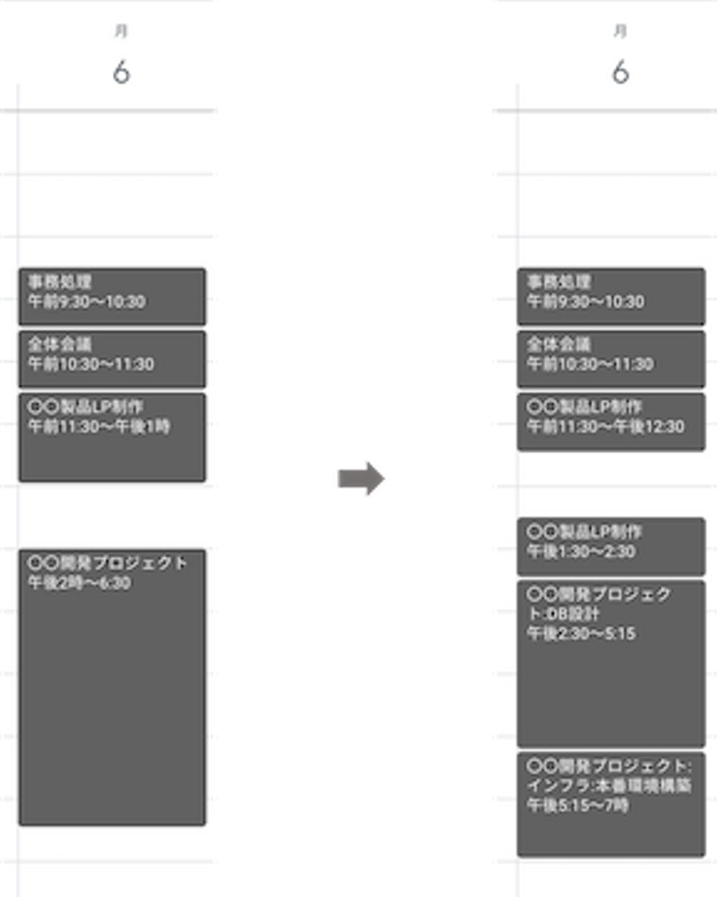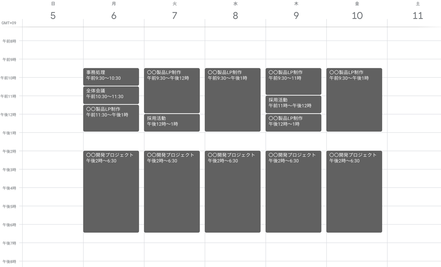 ・「午前は〇〇開発プロジェクト、午後は〇〇製品LP制作で19時に退社予定」など。