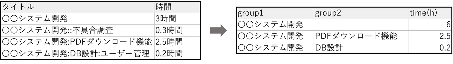 - 集計結果で「group2」が空の行は「group1」が一致するもの全ての合計時間となる。
