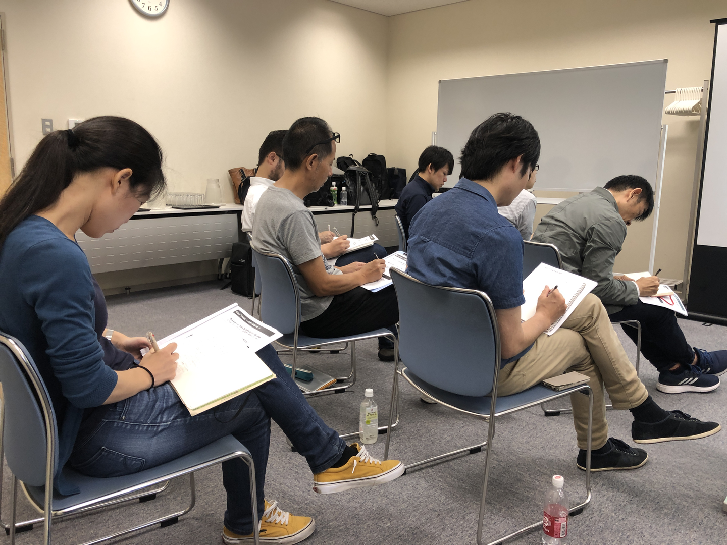 写真からも伝わってくるかと思いますが、本当に真剣ですよね。メンバーの顔を思い浮かべながら、どのように日常の対話に活かせるかを考えているのでしょうか。ちなみに右側の青いシャツが代表の江戸です。