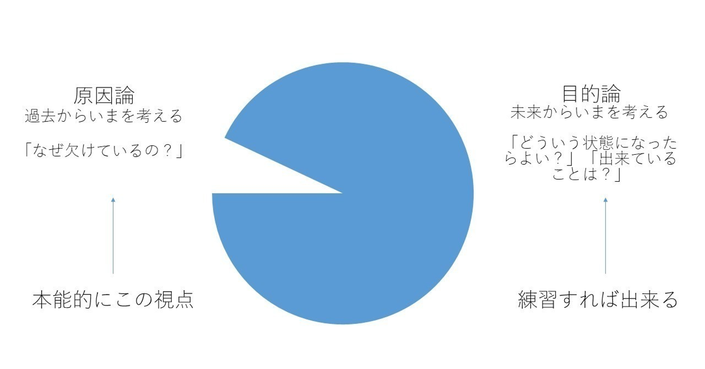 人は、本能的には原因論(過去からいまを考える)だということですが、コーチングでは、目的論(未来からいまを考える)の視点をトレーニングします。