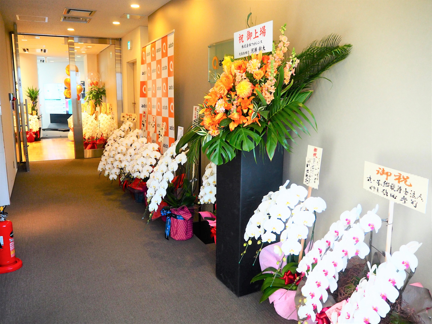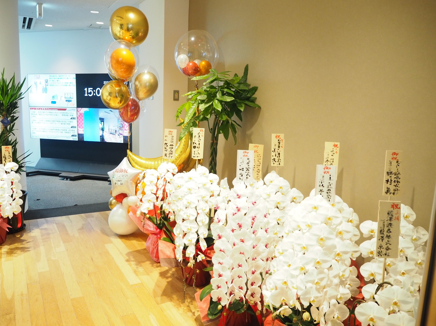 大変ありがたいことに、朝から続々とお花が会社に届きました。管理本部のメンバー総出でお花の搬入や配置を行いましたが、こんなに嬉しい仕事はない、というくらい、これまでの様々な思いがこみ上げてくる一幕でした。
