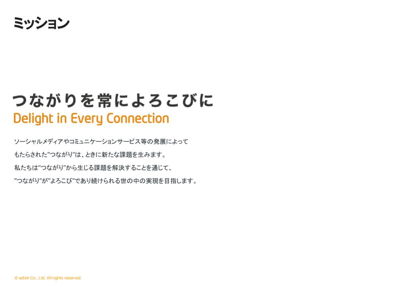 アディッシュという会社は「つながりを常によろこびに」という企業理念を掲げていまして、インターネット上で人と人がつながるからこそ起きる課題を解決したいという思いでサービスを提供している会社です。具体的には、インターネットの書き込みのモニタリング事業、それを学校向けに展開しているのがスクールガーディアン事業、そしてソーシャルアプリのカスタマーサポート事業を展開したりと、基本的には会社さんの裏方を担ってる会社です。