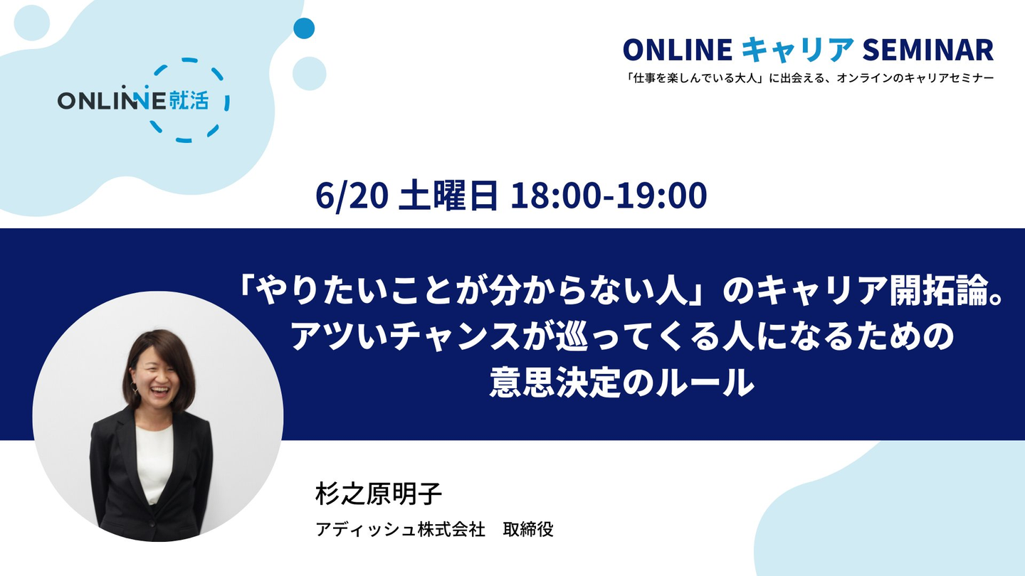 先日、地方や海外に住む学生のためのオンライン就活サービスを提供する『オンライン就活』のキャリアイベントに、アディッシュ取締役の杉之原が登壇しました!